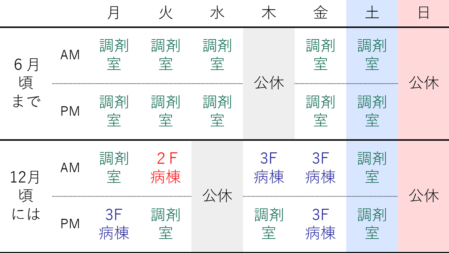 - 院内における業務を関連して理解し、10月を目安に薬剤管理指導を含め一通りの業務を担えるようにします。